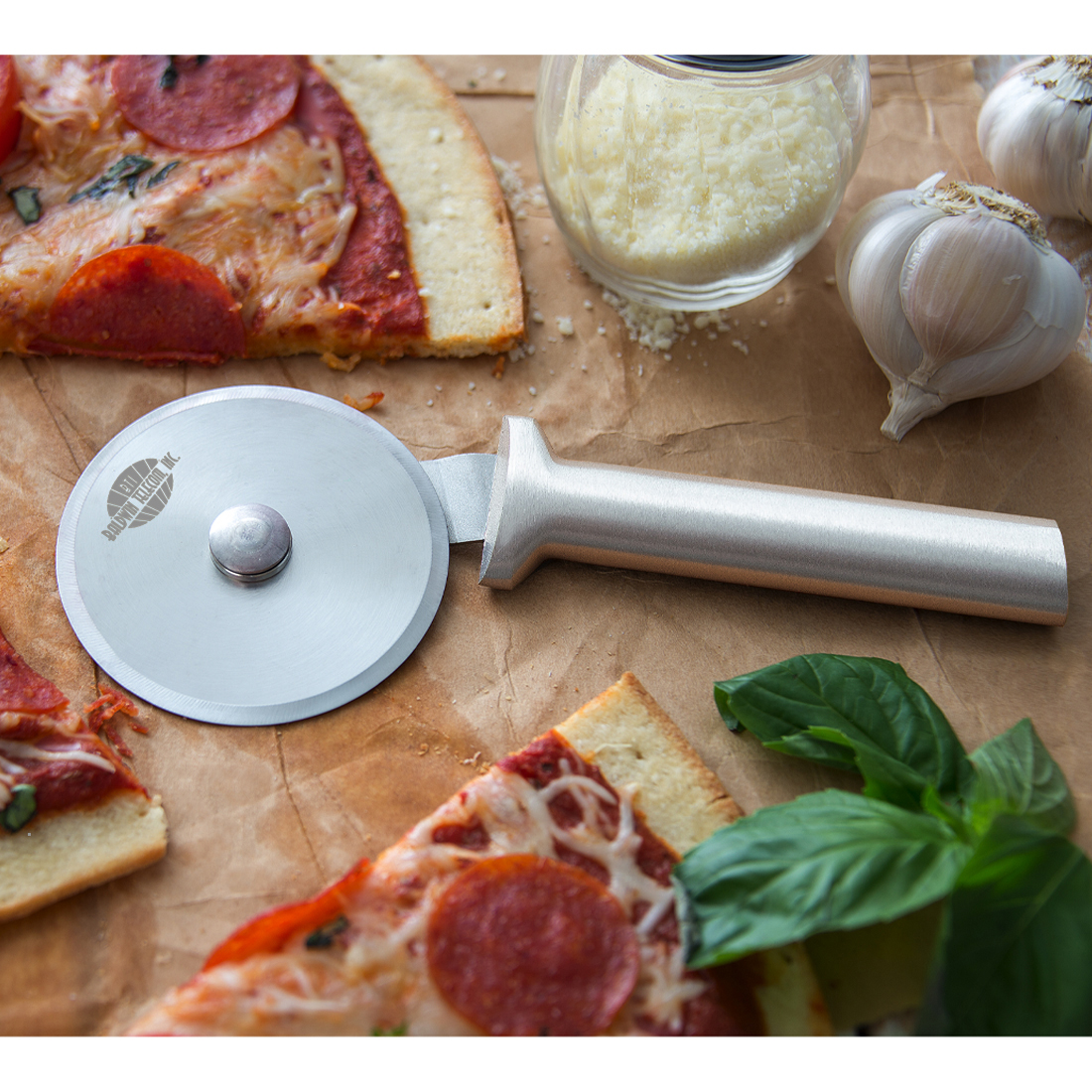 Pizza cutter with silver brushed aluminium handle and 3" wheel. Quickly cut all types of pizza, of course, but can also be used to cut bread dough, homemade pasta, herbs and more. The Overall size is 7 3/4".