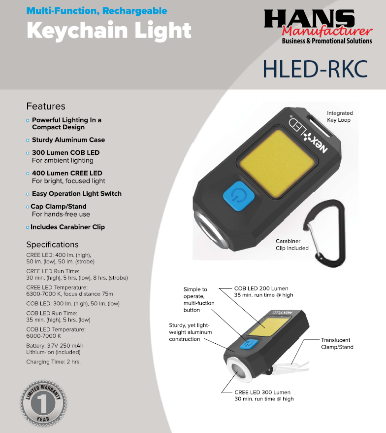* Price Includes one laser engraving on the side of the light. Imprint size: 0.22" x 1.05". Due to the small imprint area, simple text without logo is recommended.