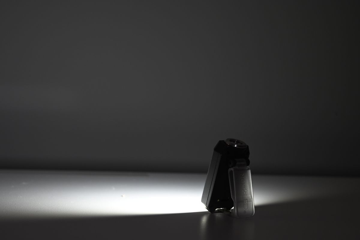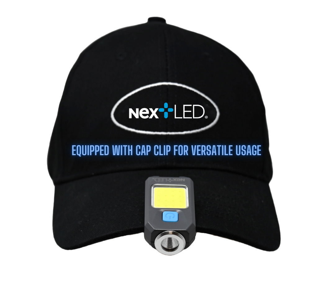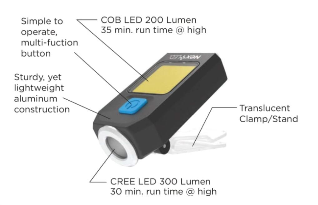 • • Multi-mount versatility with built-in cap clip, standing clamp, and key-loop for hands-free or everyday carry use.