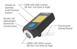 • Equipped with a versatile cap clip/standing clamp, carabiner clip, and key-loop for multiple carry or mount options.