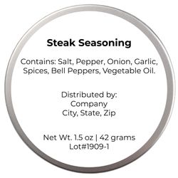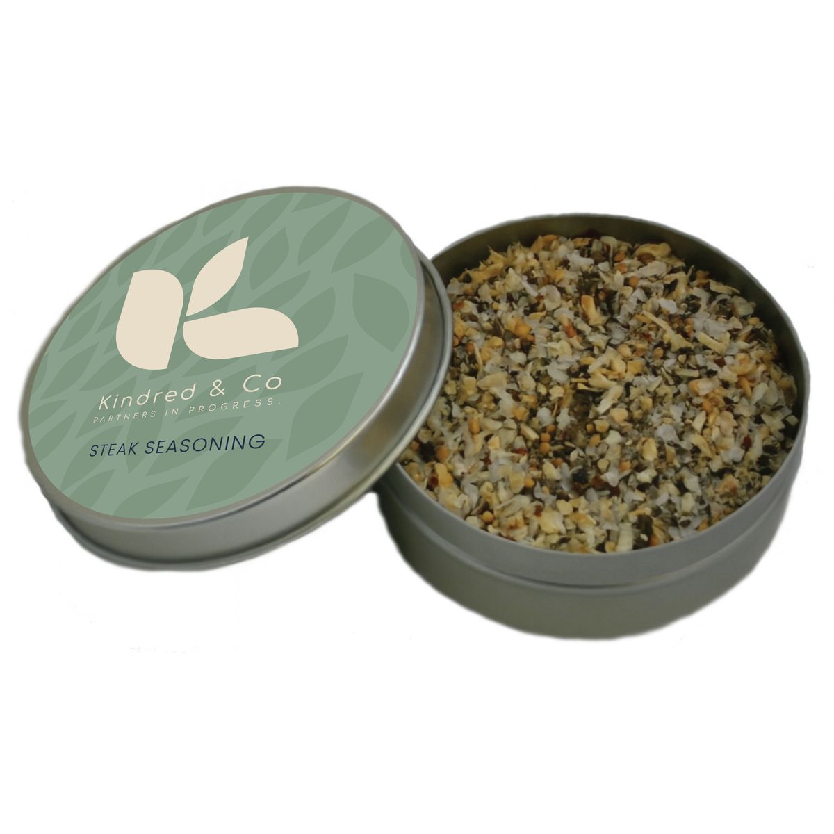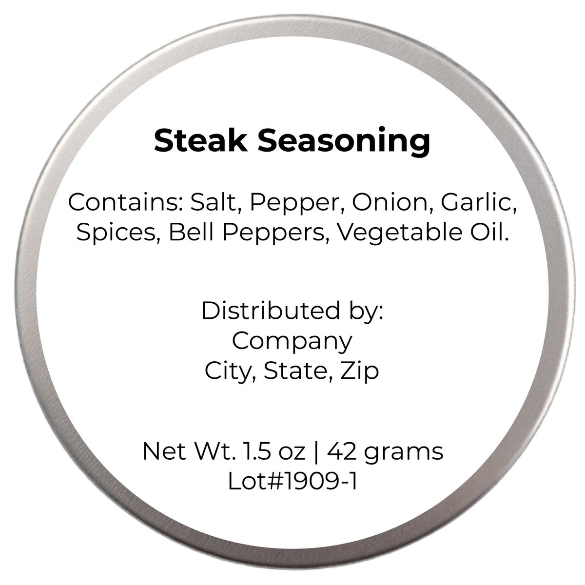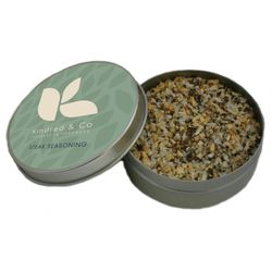 Custom labeled spice tins. 2 oz Steak Seasoning. Great for trade shows and other events. Silver tins are of high quality and make a nice gift. Good for the bbq enthusiast. Seasoning is ground fresh. Recipe for this Steak Seasoning is the best tasting spice on the market.