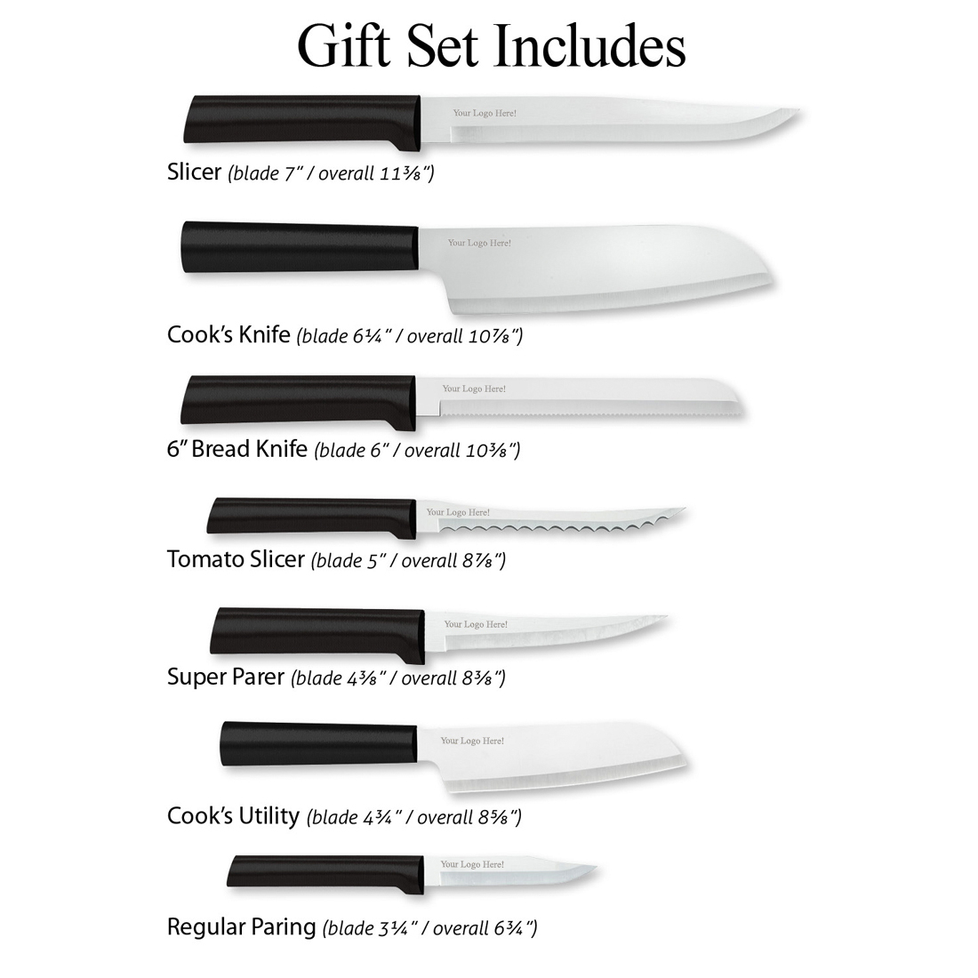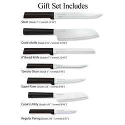 Essential oak block set with black resin black handle. Includes oak block, slicer, cook's knife, 6" bread knife, cook's utility, tomato slicer, super parer and regular paring. Six open slots to add your favorite knives.